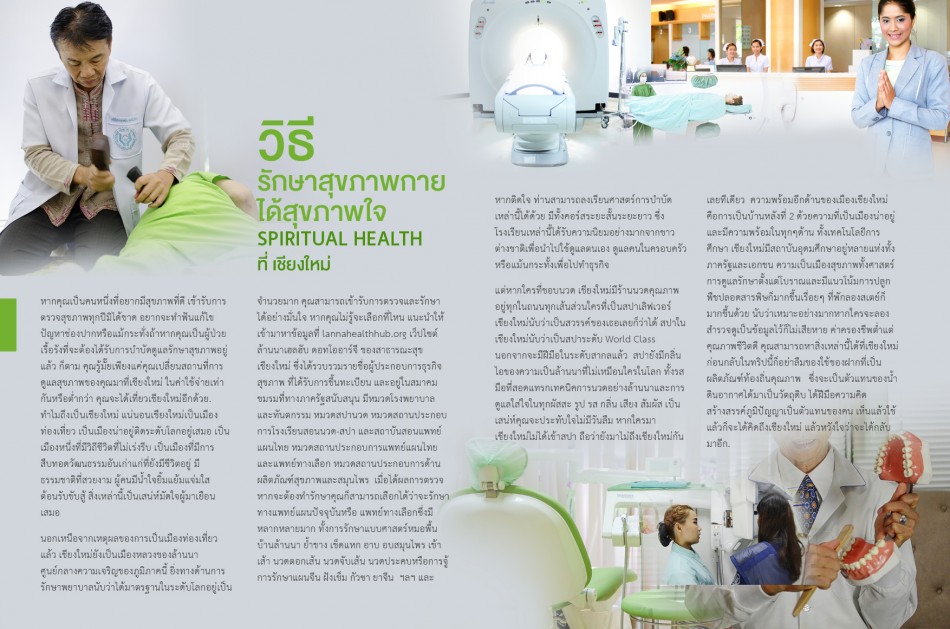 นอกเหนือจากเหตุผลของการเป็นเมืองท่องเที่ยวแล้ว เชียงใหม่ยังเป็นเมืองหลวงของล้านนาศูนย์กลางความเจริญของภูมิภาคนี้ ยิ่งทางด้านการรักษาพยาบาลนับว่าได้มาตรฐานในระดับโลกอยู่เป็นจำนวยมาก คุณสามารถเข้ารับการตรวจและรักษาได้อย่างมั่นใจ หากคุณไม่รู้จะเลือกที่ไหน แนะนำให้เข้ามาหาข้อมูลที่ lannahealthhub.org เว็ปไซต์ล้านนาเฮลฮับ ดอทโออาร์จี ของสาธารณะสุขเชียงใหม่ ซึ่งได้รวบรวมรายชื่อผู้ประกอบการธุรกิจสุขภาพ ที่ได้รับการขึ้นทะเบียน และอยู่ในสมาคมชมรมที่ทางภาครัฐสนับสนุน มีหมวดโรงพยาบาลและทันตกรรม หมวดสปานวด หมวดสถานประกอบการโรงเรียนสอนนวด-สปา และสถาบันสอนแพทย์แผนไทย หมวดสถานประกอบการแพทย์แผนไทยและแพทย์ทางเลือก หมวดสถานประกอบการด้านผลิตภัณฑ์สุขภาพและสมุนไพร เมื่อได้ผลการตรวจหากจะต้องทำรักษาคุณก็สามารถเลือกได้ว่าจะรักษาทางแพทย์แผนปัจจุบันหรือ แพทย์ทางเลือกซึ่งมีหลากหลายมาก ทั้งการรักษาแบบศาสตร์หมอพื้นบ้านล้านนา ย้ำขาง เช็ดแหก อาบ อบสมุนไพร เข้าเส้า นวดตอกเส้น นวดจับเส้น นวดประคบหรือการจู้ การรักษาแผนจีน ฝังเข็ม กัวซา ยาจีน ฯลฯ และหากติดใจ ท่านสามารถลงเรียนศาสตร์การบำบัดเหล่านี้ได้ด้วย มีทั้งคอร์สระยะสั้นระยะยาว ซึ่งโรงเรียนเหล่านี้ได้รับความนิยมอย่างมากจากชาวต่างชาติเพื่อนำไปใช้ดูแลตนเอง ดูแลคนในครอบครัวหรือแม้นกระทั้งเพื่อไปทำธุรกิจ